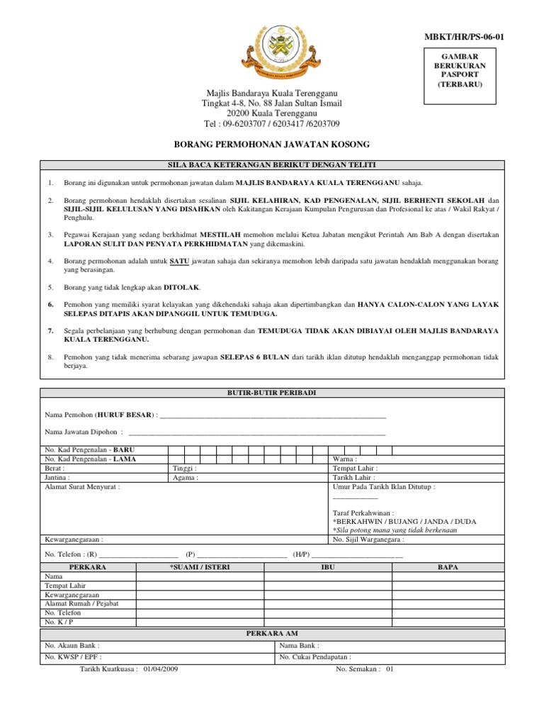 Borang Jawatan Kosong Majlis Bandaraya Kuala Terengganu Mbkt Jan 2010 Pdf